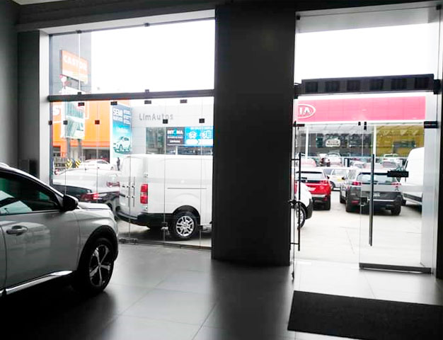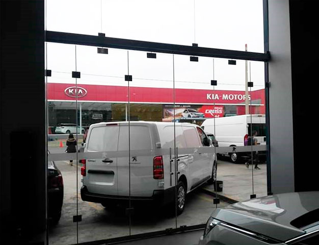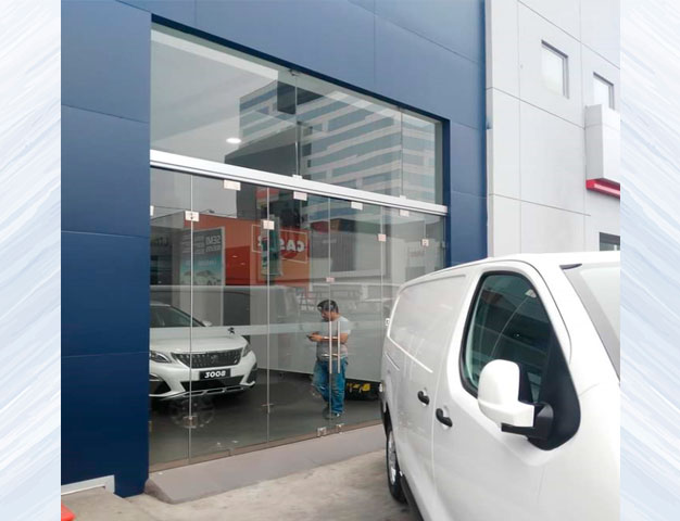 Mamparas sala de exhibición muros de vidrio o paneles.
