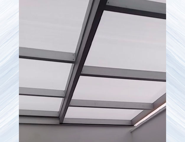 Techo de policarbonato fijo y corredizo, con estructura de aluminio y sistema de cierre con polea.